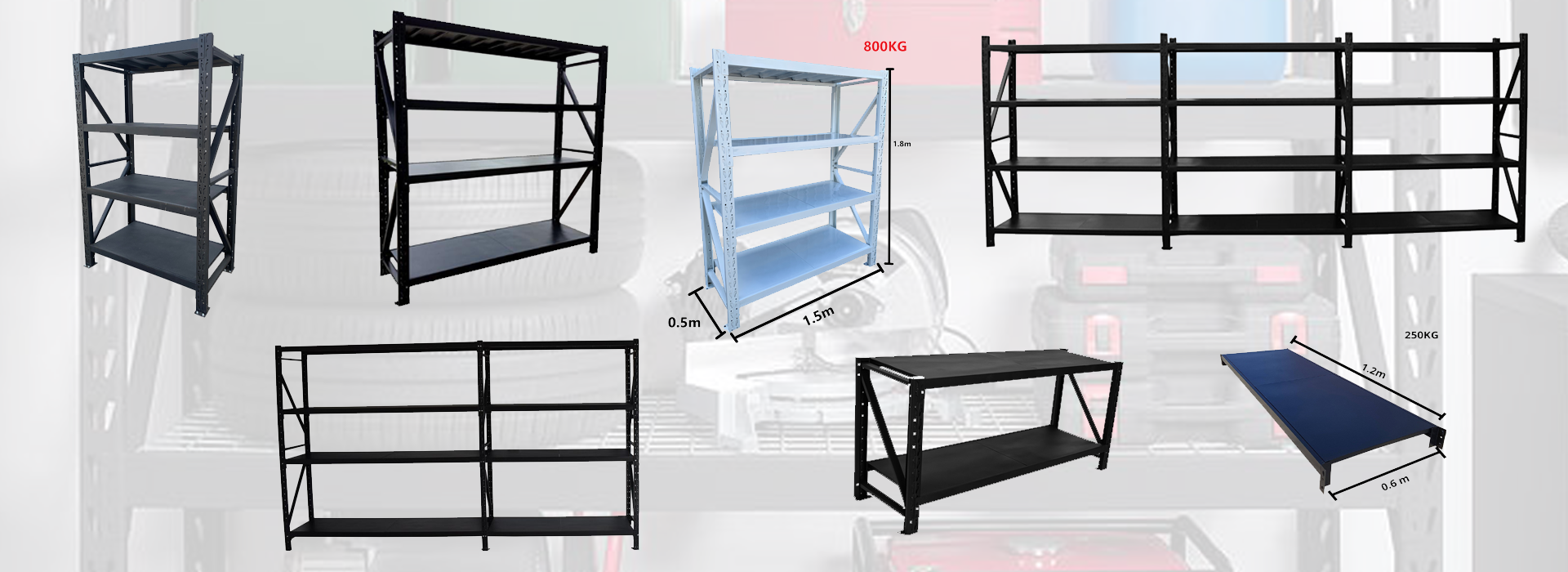2.0m (wide) x 1.8m (height) x 0.6m (depth) shelving connecting with a 0.9m (high) x 2.0m (wide) x 0.6m (deep) workbench